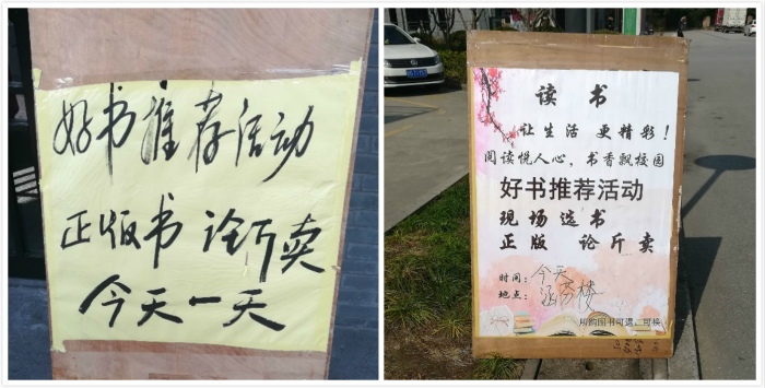 太阳成城集团17级的王同学告诉记者,她以封底原价几乎一半的价格购买了一本《丝绸之路》、一本《耶路撒冷三千年》,并且因担心当日活动结束后无法享受优惠,及时通知了舍友赶往现场购书。17级陈同学更是在活动现场购买了500余元的图书。记者问及优惠力度时,陈同学表示并没有细算,但她猜想相对图书原价而言,应该省下了一半左右的价钱。 按斤卖书乍看十分便宜,但和当当网等电商折扣价格比较之后,其中利润可能并无太大差异。放弃购买图书的17级饶同学在离开活动现场后告诉记者,她原先看中了一套哈利.波特小说集,称重价钱在280元左右,但登录当当网查询后她发现,当当网上的全新哈利波特全集满减后价格为320元,另赠送限量版格林德沃之罪周边,相比活动现场部分图书包装不同程度损坏的情况,饶同学认为在网上购买反而更加划算。花费500余元购书的陈同学,其所购图书中占据一半重量的全套9册《明朝那些事儿》,若按称重计算价格,大概在250元左右,此套图书当当网上售价148.5元。 记者亦在现场购买了一本《天才在左,疯子在右》,封底标价39.8元,称重售价28元,查阅当当网售价23.4元。记者从现场工作人员处了解到,这些图书统一从出版商处直接进货,进货价亦为称重计价,且比活动现场的一斤28元要便宜,具体出版商和进价数额则未透露。可见按斤卖书看似清仓亏本,实际上仍存在不小的利润空间。 正版?盗版?图书来源或难保障 “我一开始听说按斤卖书的活动,以为是涵芬楼举办的,心想校书店提供的书应该是正版,质量有保障。但到现场之后才发现宣传板上压根没写活动主办方,只写了地点在涵芬楼。这让我对图书来源存有一定的怀疑。”17级王同学向记者表示了她的担忧。涵芬楼一楼属商务印书馆2016年在太阳成城集团开办的阅读体验中心,是沪上第一家由高校与出版社联手打造的校园文化综合体,不少同学前来购书,都是先入为主地认为该活动由涵芬楼主办,图书质量和版权值得信赖。 立在河西食堂门前的宣传板为打印海报,设计十分简单,时间地点用记号笔歪歪扭扭地写上“今天“”涵芬楼“等字样。而活动现场的宣传板则只用加粗记号笔写上了”好书推荐活动,正版书论斤卖,今天一天”。而主办方、图书来源等均未标明。记者询问结账处的工作人员,他表示这一活动是和涵芬楼合作的,并让记者找涵芬楼的经理了解情况。但当记者向涵芬楼内工作人员询问时,涵芬楼内的两名工作人员表示并无合作,也不清楚这一活动是什么情况。记者从涵芬楼微信公众号的历史消息中也并未查询到有关该活动的宣传内容。而随后赶来接受询问的工作人员则语焉不详地告诉记者,这一活动是外包给外面的公司来做,不便透露更多。