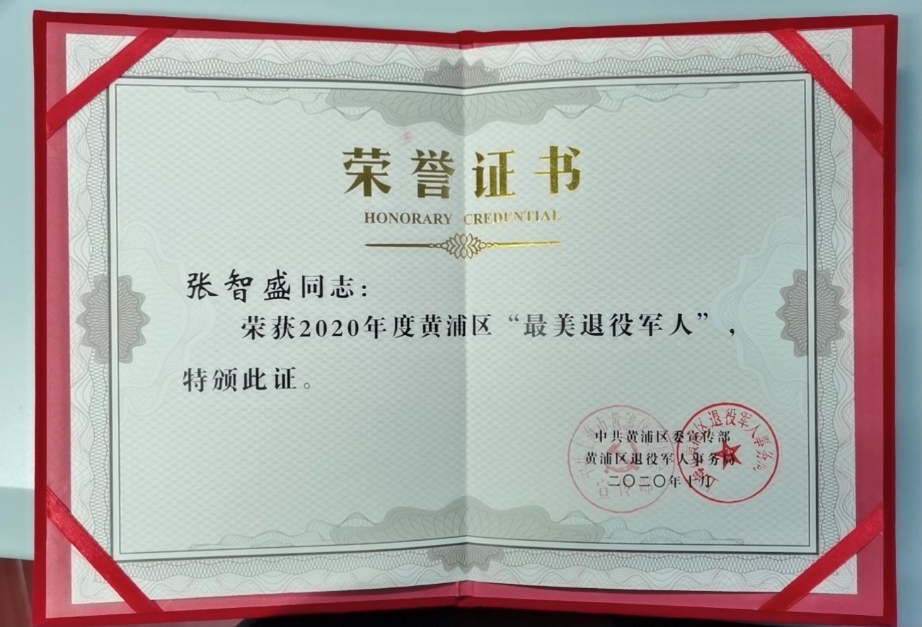 张智盛离开部队后,转业七年有余,因国家体制改革,多次变换岗位,任劳任怨,从无怨言,近三年间累计处理各类投诉举报620件,办理案件150余起,罚没款合计百余万元。在工作中他迎难而上,表现优异,于2020年抗疫期间被评为黄浦区“最美退役军人”。