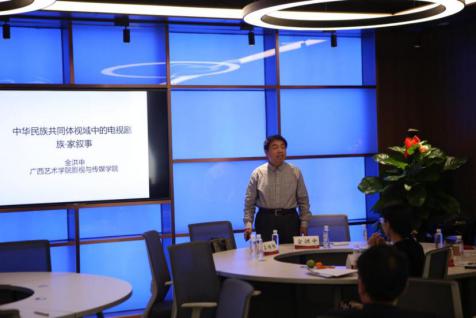 广西艺术学院副教授金洪申的演讲主题是《中华民族共同体视域中的电视剧族·家叙事》,他主要讲述了电视剧艺术的现实基础和中国电视剧的特征,以及中华民族共同体视域下中国电视剧的缺憾,并分析了中国电视剧中的中华民族共同体这一标志未能鲜明体现的原因。