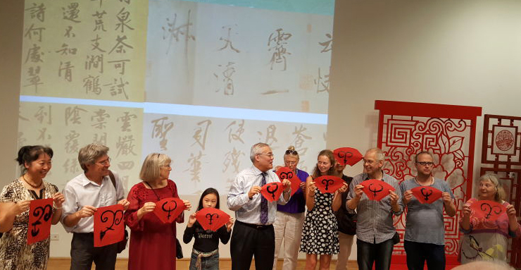 联合国的课程结束后,周斌与员工共同展示当天的书法成果。