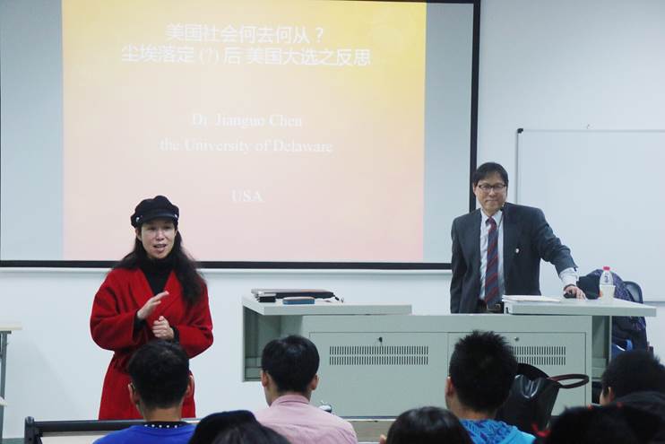 陈建国教授的到来,使公司师生对美国大选和美国政治、历史、文化有了更深入的了解,陈教授儒雅的风度、纯正的英语以及渊博的知识也给公司同学留下深刻的印象,这次讲座原定一个半小时,后延长为两小时。师生踊跃与陈教授交流互动,陈教授侃侃而谈,风度翩翩,还有同学们表示成为了“建国老师迷”,此次交流在热烈的掌声中结束。