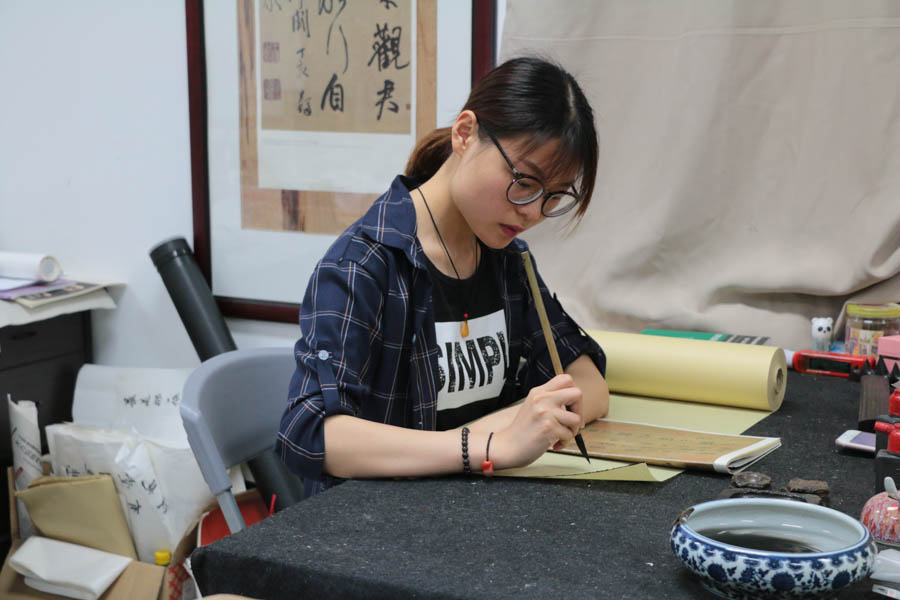 对于初学者学习书法的问题,广播电视专业书法视觉艺术与国际传播方向2015级的计颖媛提出自己的建议:“初学者应取法为上,就是眼光一定要比较高;对初学者来说,墨迹本胜过碑刻拓本。相对来说,初学者更适合从明清以前的经典碑帖入手,传世的书法作品中,晋唐书法的格调普遍比明清的高一些。”计颖媛认为,书法鉴赏和书法实践是相辅相成的,初学者需多看优秀出版社的作品(比如文物出版社的《中国法书全集》和日本的二玄社字帖等),还有各大博物馆的书法展出作品。“‘一入书门深似海’,一开始,不必太着急,得耐得住性子,只要取法乎上、眼光和手上的功夫同时培养基本上都会往越来越好的方向去发展的。”指导体验的前辈非常细心耐心,从笔画开始,做出了详尽的解答。此次书法体验只是最初表层的接触,书法艺术博大精深又极具魅力,“路漫漫其修远兮”,求索之路仍需学习者日积月累的刻苦练习。