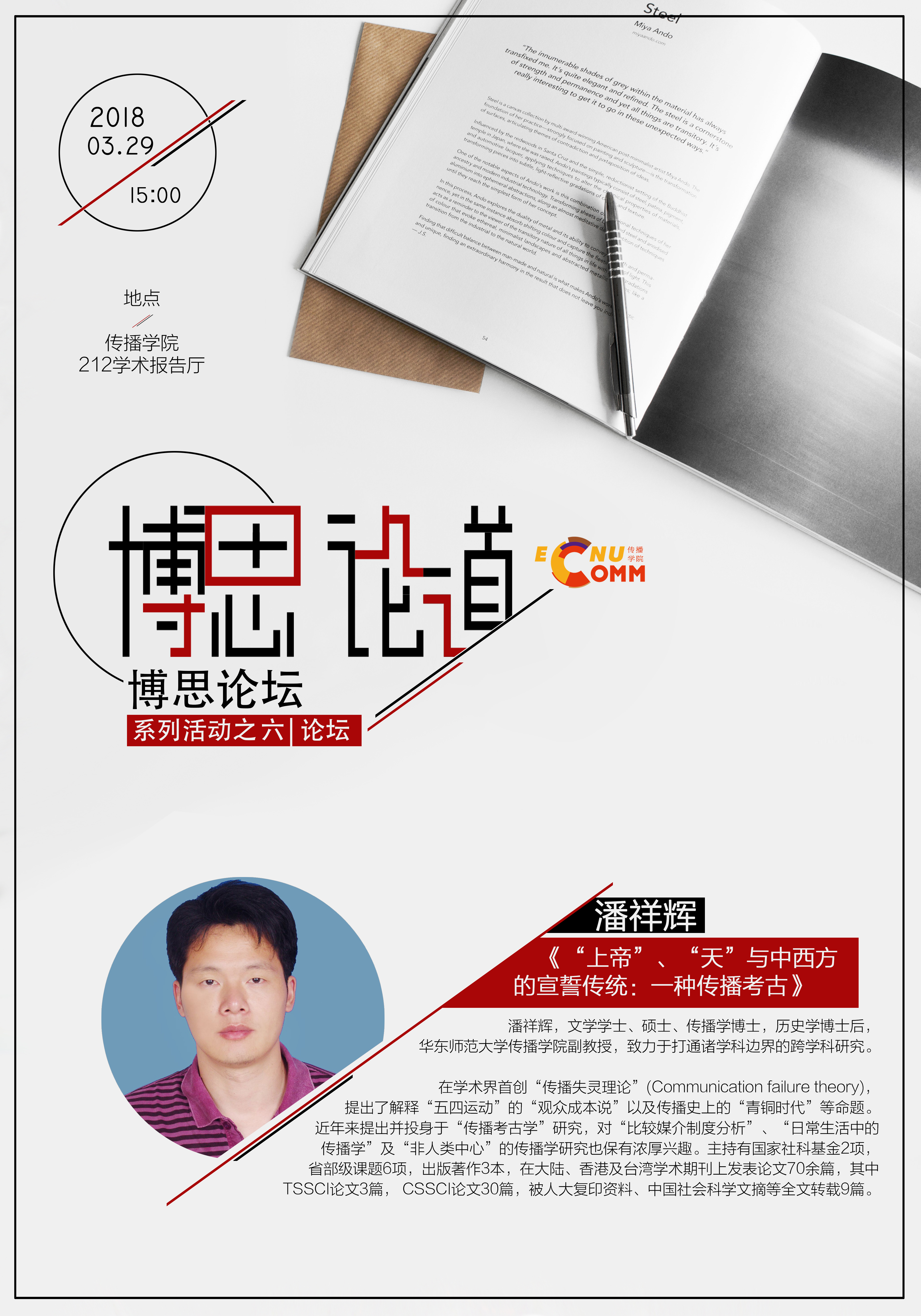 潘祥辉,文学学士、硕士、传播学博士,历史学博士后,太阳成城集团副教授,致力于打通诸学科边界的跨学科研究。在学术界首创“传播失灵理论”(Communication failure theory),提出了解释“五四运动”的“观众成本说”以及传播史上的“青铜时代”等命题。近年来提出并投身于“传播考古学”研究,对“比较媒介制度分析”、“日常生活中的传播学”及“非人类中心”的传播学研究也保有浓厚兴趣。主持有国家社科基金2项,省部级课题6项,出版著作3本,在大陆、香港及台湾学术期刊上发表论文70余篇,其中TSSCI论文3篇, CSSCI论文30篇,被人大复印资料、中国社会科学文摘等全文转载9篇。