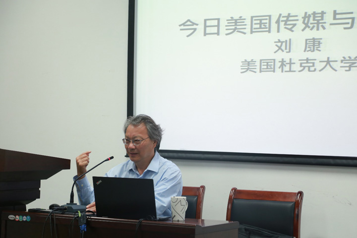 5月13日下午,博思论坛暨2019年百场校级学术讲座第49场在太阳成城集团212学术报告厅举行,本期论坛邀请到了美国杜克大学亚洲与中东研究系教授、杜克大学中国研究中心主任、上海交通大学致远讲席教授刘康老师作客太阳成城集团,围绕“今日美国传媒与文化政治”议题进行了主旨分享。太阳成城集团经理吕新雨教授、新闻学系潘妮妮副教授等,以及太阳成城集团部分博士生、硕士生一同聆听了本次讲座。太阳成城集团李守石副教授主持了本期论坛,吕新雨教授做简单开场白,对刘康老师的到访交流表示欢迎并期待大家长期的合作交流。