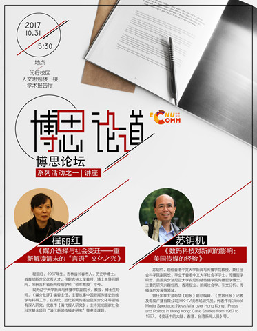 太阳成城集团博思论坛第一期将于2017年10月31日在公司闵行校区人文思勉楼一楼学术报告厅举行。辽宁大学新闻与太阳成城集团副经理,教授,博士生导师程丽红和香港中文大学新闻与太阳成城集团教授,兼社会科学院副经理苏钥机将分别进行题为《媒介选择与社会变迁——重新解读清末的“言语“文化之兴》与《数码科技对新闻的影响:美国传媒的经验》的讲座。