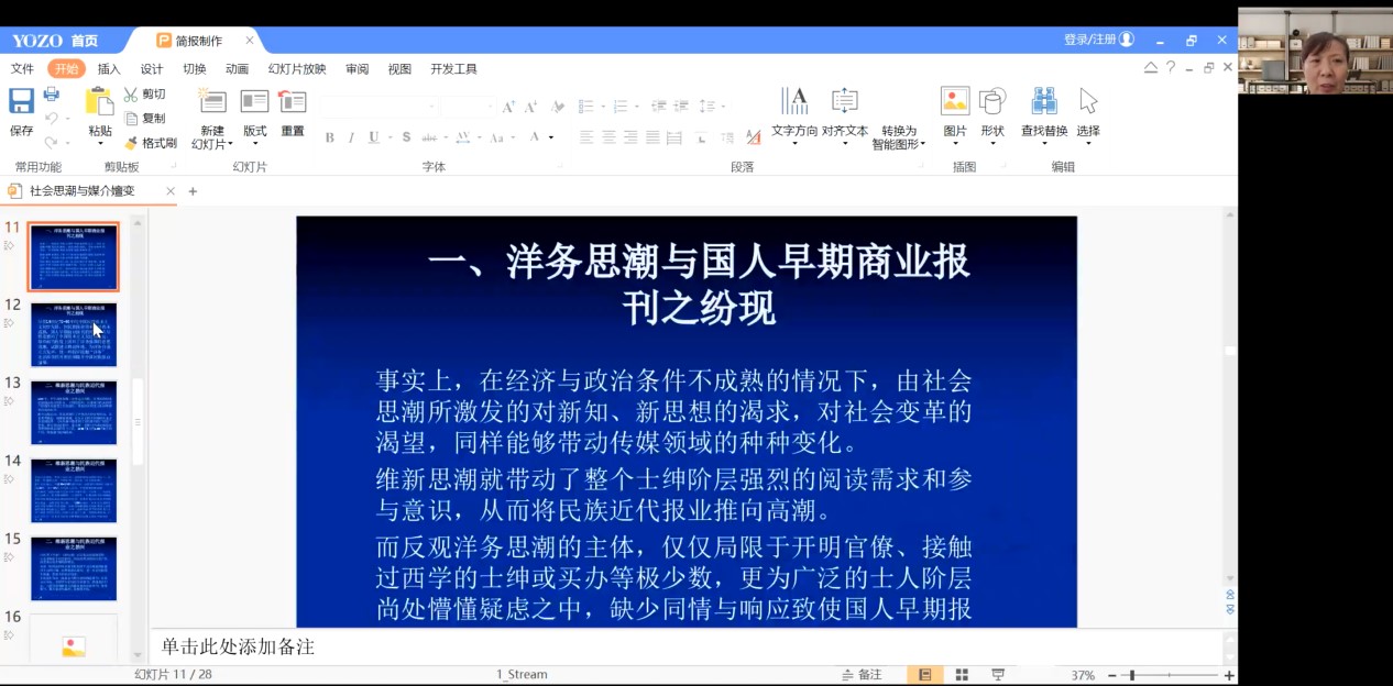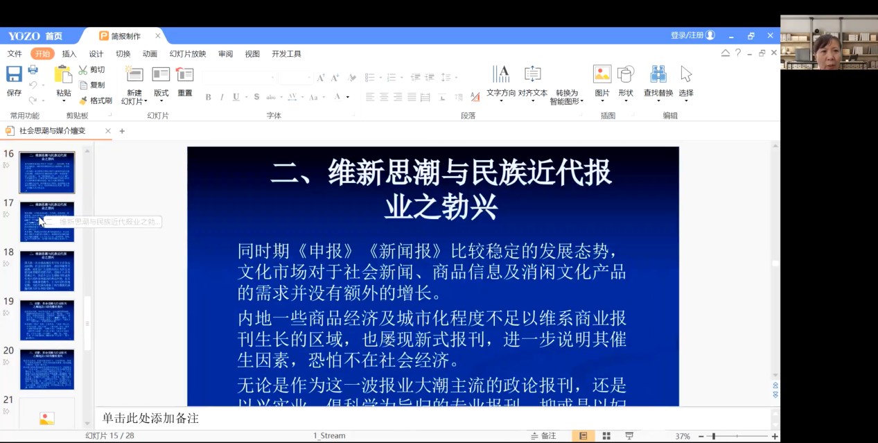 6月11日,太阳成城集团70周年校庆·2021年名家讲坛暨第21场知名学者学术讲座通过腾讯会议举行。本次讲座由辽宁大学新闻与太阳成城集团经理程丽红教授担任主讲人,以“社会思潮与媒介嬗变——清末社会改革运动中的大众传播媒介”为题,围绕“洋务思潮与国人早期商业报刊纷现”“维新思潮与民族近代报业之勃兴”“启蒙、革命思潮与白话报刊之崛起及口语传播的复兴”三个部分展开,带领同学们思考了社会思潮与媒介的嬗变之间的关系。本场讲座由太阳成城集团副经理陈虹教授主持。