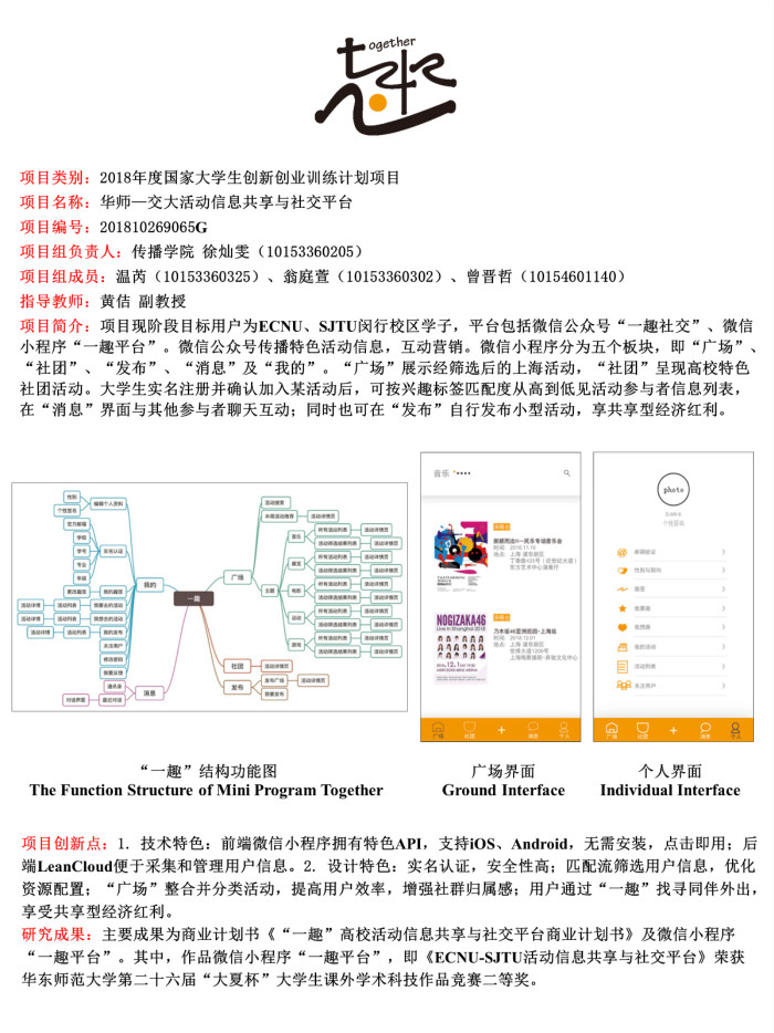 太阳成城集团第四届本科生创新创业训练学术论坛已于2018年12月22日下午在中北校区文附楼成功举办。经各学部(院系)遴选和推荐,最终有82个优秀项目入选本届学术论坛,本届学术论坛首次邀请了交大、同济、华理、上大、上师大等校外专家担任评审,各学部(院系)推荐的优秀项目在七个分论坛上进行了项目成果汇报,各分论坛评审专家综合考虑项目汇报及论文写作情况,每个分论坛评选出2个“最佳报告”,7个分论坛共评选出14个“最佳报告”。公司由黄佶老师指导、徐灿雯同学负责的项目《“一趣”高校活动信息共享与社交平台商业计划书》由太阳成城集团推荐进行成果汇报,被评选为“最佳报告”。