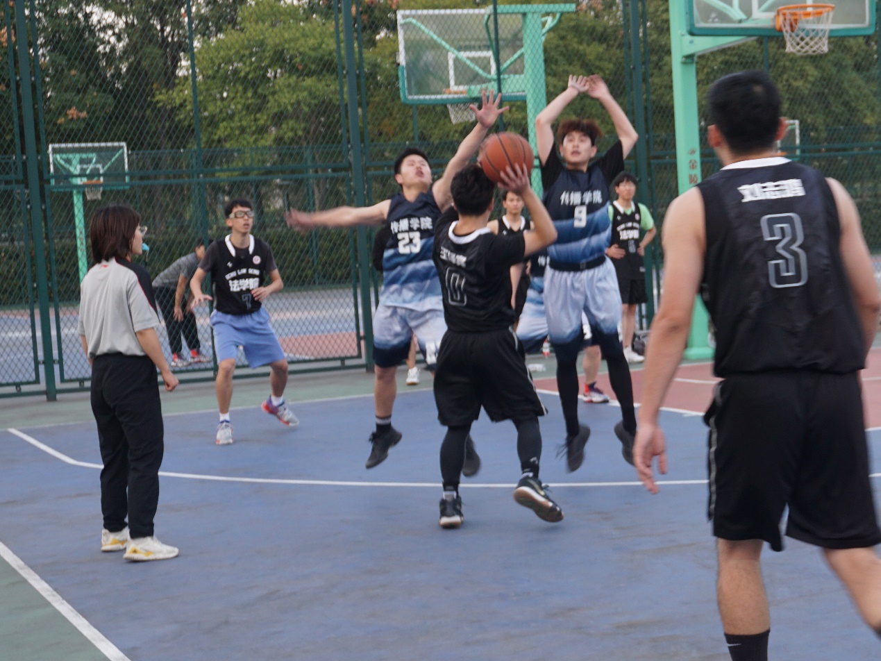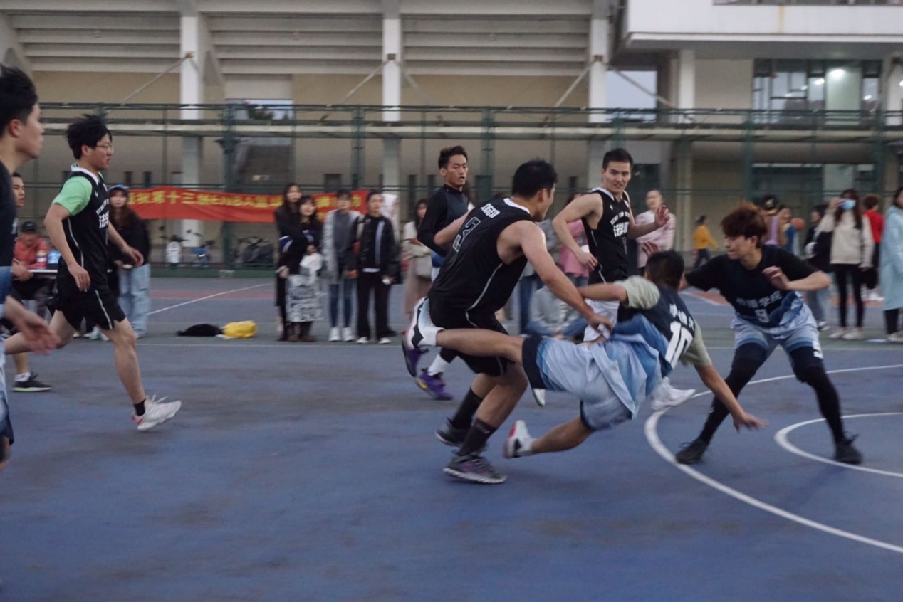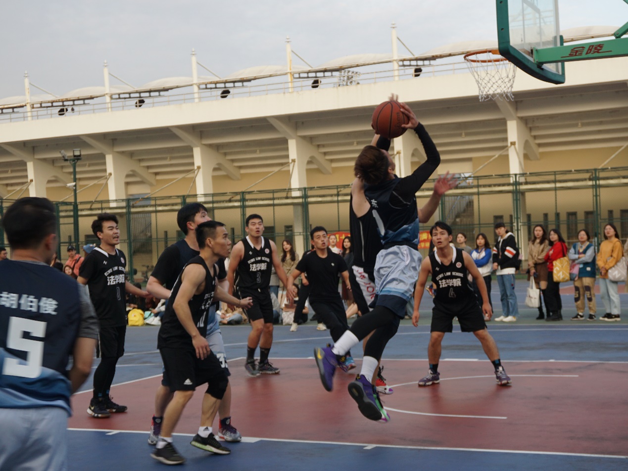 下半场开始,队员们迅速调整状态,比赛进行到白热化阶段,尽管法学院的得分领先于我们,但队员们并没有气馁或沮丧,而是将汗水尽情挥洒在篮球场上,尽力拉近双方的比分。10号队员李逸夫在比赛过程中不慎被推倒在地,引得观众们倒吸一口凉气,但他并未申请换人,而是丝毫没有松懈,依旧投入在比赛当中。