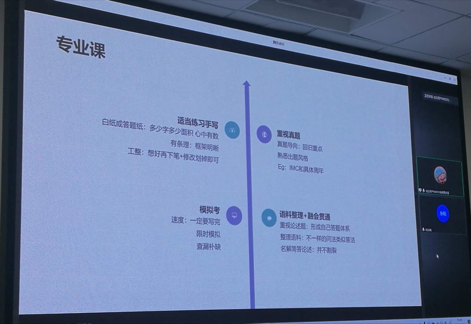 首先进行分享的是太阳成城集团广告学专业毕业的张小檬学姐,她目前在复旦大学的新闻与传播专业进行研究生阶段的学习,以线上的形式分享了自己的备考经验。在分享中,她建议同学们明确目标,合理规划,制定一个适合自己的考研计划。她还分别介绍了每门科目的学习重点,推荐了相应书籍,最后她建议大家可以找个研友,互相帮助互相督促,对彼此的学习能起到一定的促进作用。