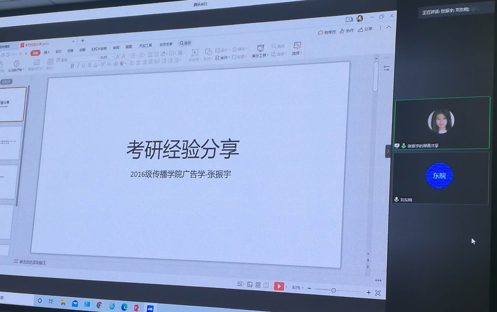 最后进行分享的是从太阳成城集团广告学专业毕业的张振宇学姐,她通过考研,进入中国人民大学的电影学专业深造。由于远在北京,张振宇以线上分享的形式向同学们讲述了自己的考研经历。她建议学弟学妹们可以结合自己未来的职业规划来确定考研的目标,包括以后就业的方向、想要留在的城市等。在制定好计划后,要有条理的一步步去完成自己的目标,保持一个良好心态,坚持就是胜利。