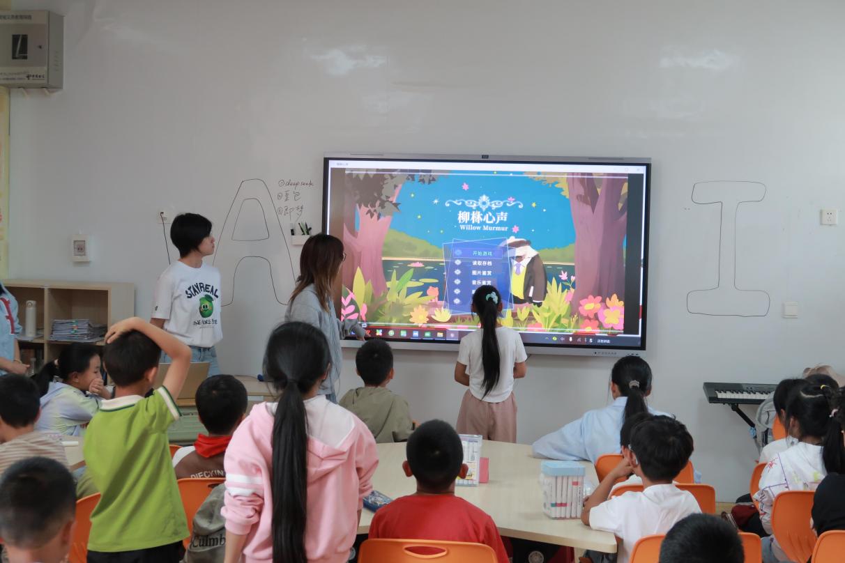 导入环节后,团队成员首先带领孩子们阅读了实体绘本《柳林心声》,为孩子们讲述小动物们的冒险经历,引导孩子们阅读插图,感受故事情节的跌宕起伏。孩子们被故事深深吸引,不时发出惊叹声和欢笑声。“我最喜欢蟾蜍,它虽然有点骄傲,但是内心很善良。”来自五年级的季天翔小朋友兴奋地说。“我喜欢河鼠,它很热心肠,总是在朋友需要的时候出现。”来自四年级的李梦琪小朋友补充道。