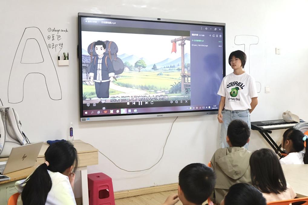 吕佳颖同学正在给孩子们播放AI影像作品《唐弢》