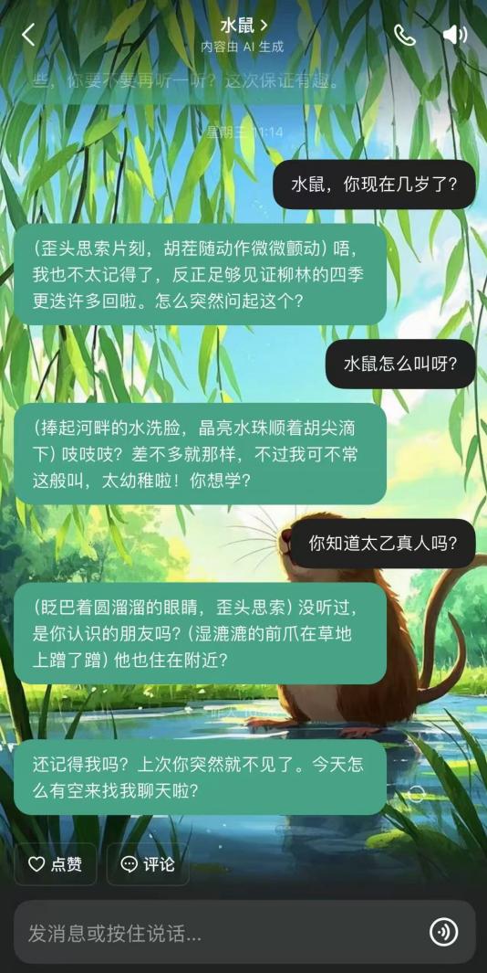 除了纸质与电子绘本外,“艺启心扉”团队还借助豆包AI助手开发了小动物智能体,将作为《柳林心声》绘本主人公的小动物转化为四个性格迥异的 AI 情感伙伴,孩子们可以自主选择喜欢的小动物智能体,以语音或文字的方式,与小动物智能体分享他们的情绪故事,而小动物智能体则将给予每个孩子个性化的温暖陪伴、交流和支持。