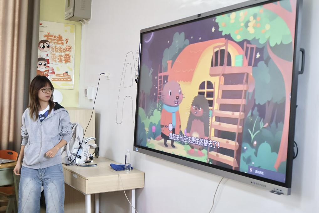 在孩子们对实体绘本表现出浓厚兴趣后,团队成员引导大家转向电子绘本阅读。色彩鲜艳的画面、生动自然的配音、触屏互动的阅读形式,电子绘本一经展示就吸引住了孩子们的目光。五年级的唐毅凯小朋友提到“这本书里的小动物好像真的在和我们说话一样!”孩子们对这种新颖的学习方式表现出了极大的兴趣,纷纷表示喜欢这种可以互动的绘本。“我们发现,孩子们对互动性强、内容贴近生活的产品更感兴趣。”实践团队中的钱恩朵同学说道,“例如,电子绘本中的互动元素和自然元素,比如鲜花,都极大地吸引了孩子们的注意力。这让我们意识到,要让AI工具真正被乡村孩子接受并喜爱,必须紧密结合他们的生活实际和兴趣爱好。”