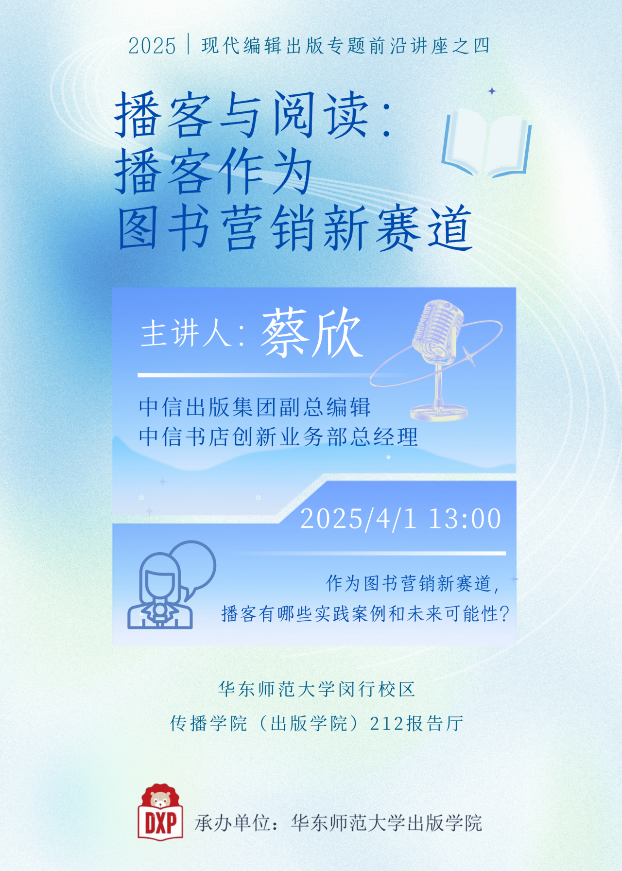 继直播、短视频卖书后,出版机构又开拓出新的线上图书营销赛道——播客。自2020年“中文播客元年”后,大量出版机构、编辑、作者群投身播客,运营出许多优秀的播客节目,在影响力和商业转化力上进行不同的探索。播客节目俨然已经成为优质内容图书营销的标配之一。播客与阅读有着千丝万缕的联系,作为图书营销新赛道,播客又有哪些实践案例和未来可能性?这场分享希望能跟各位同学有一场头脑风暴。